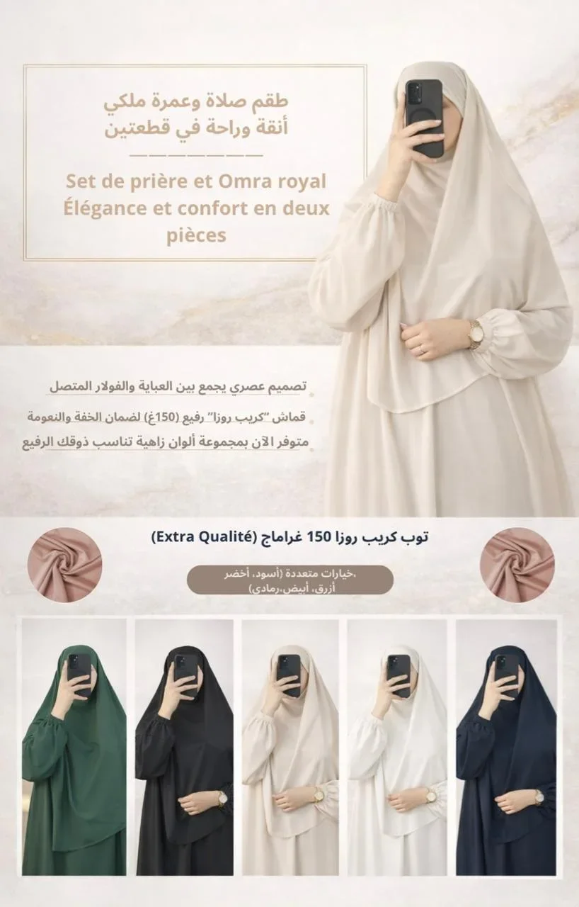 منتجاتنا مصنوعة من توب كريب روزا رطب و عالي الجودة، بقصّات واسعة و طويلة، مع فولار باش تكوني ديما واجدة للصلاة بلا تعب ولا حيرة